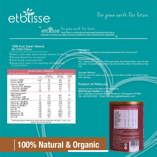 ●100% 純南杏仁(不經搾油加工)、寡糖(萃取自菊苣根) ●支持腸道中雙歧桿菌生長, 促進腸胃蠕動 ●蘊含杏仁油和維生素E有助美白, 同時當中的不飽和脂肪酸支持心臟健康 沖調方式 : 將1湯匙(10克)加入150毫升的溫水、植物奶或燕麥, 攪拌後便可飲用。 推薦予 : 適用於1歲以上兒童和膚色不均、受排毒問題困擾、關注氣管問題的人士。 容量:400g 出產地:馬來西亞